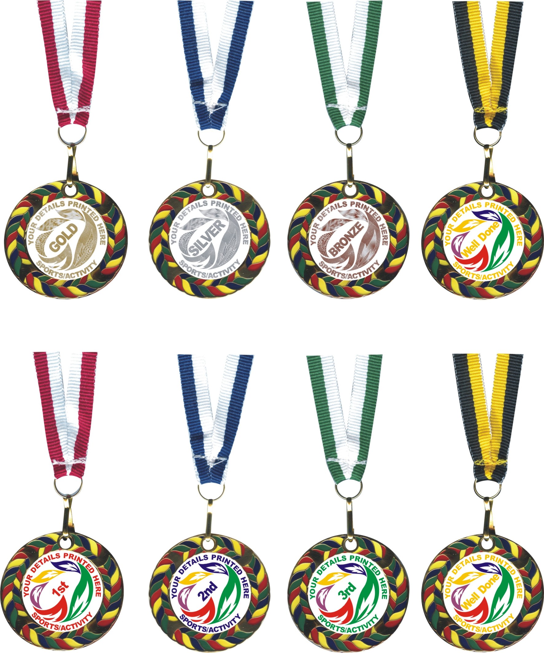 Blaze Awards are available as shown complete with ribbons as illustrated. The cost for printing the details you require on the top and bottom line is included in the price and you can give your medals even more impact by applying domed centres.