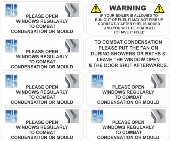 These simple peel off and stick on labels are designed to assist landlords by encouraging tenants to act responsibly and encouage good practice within the dwelling.