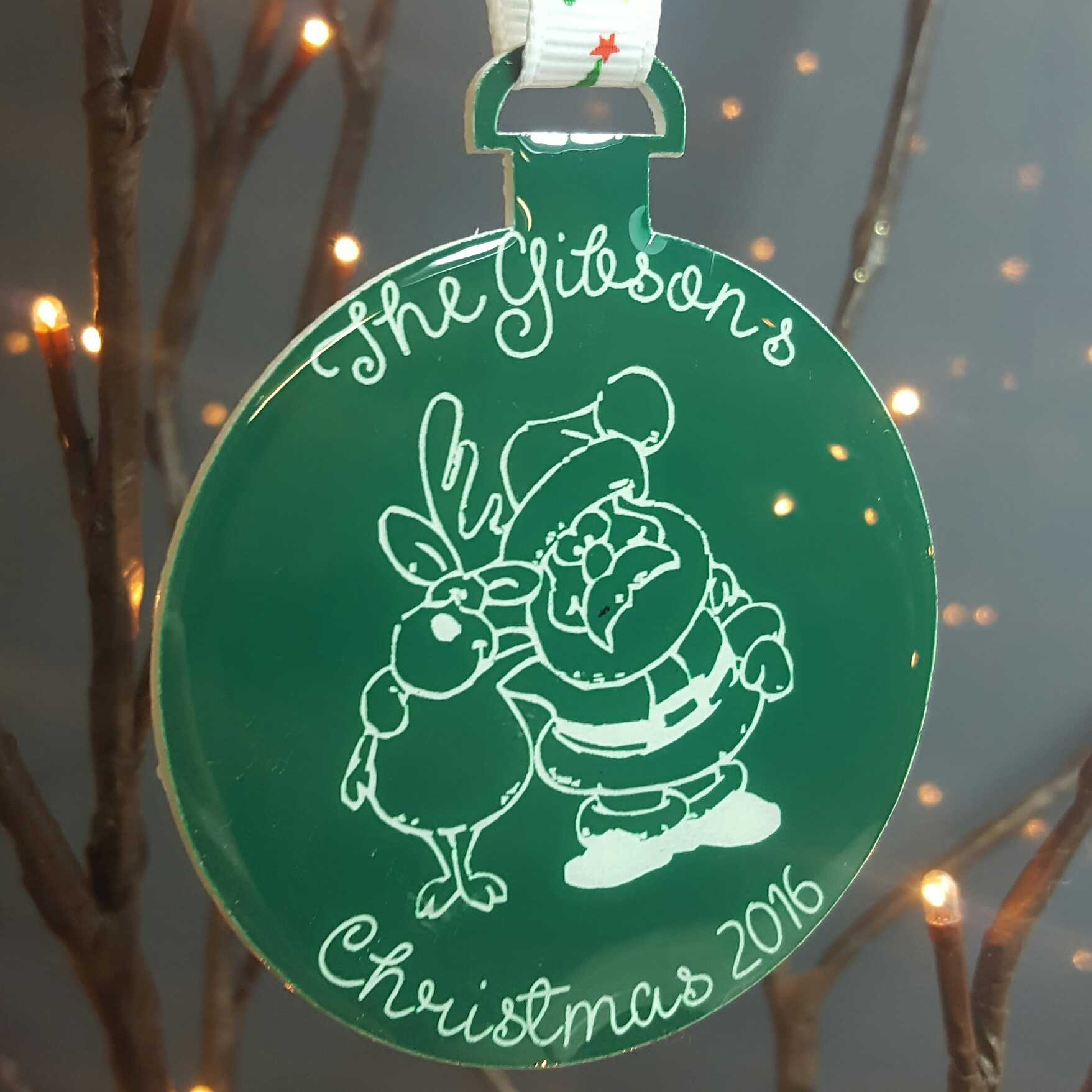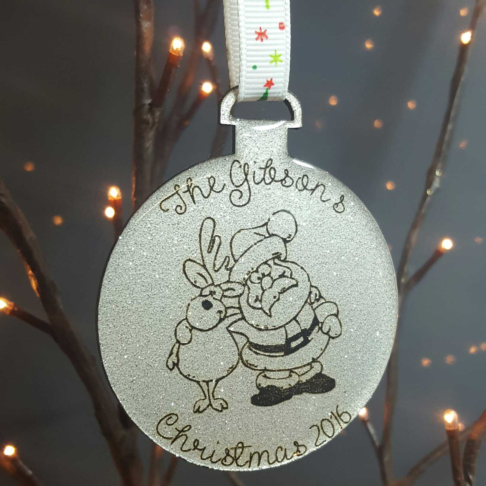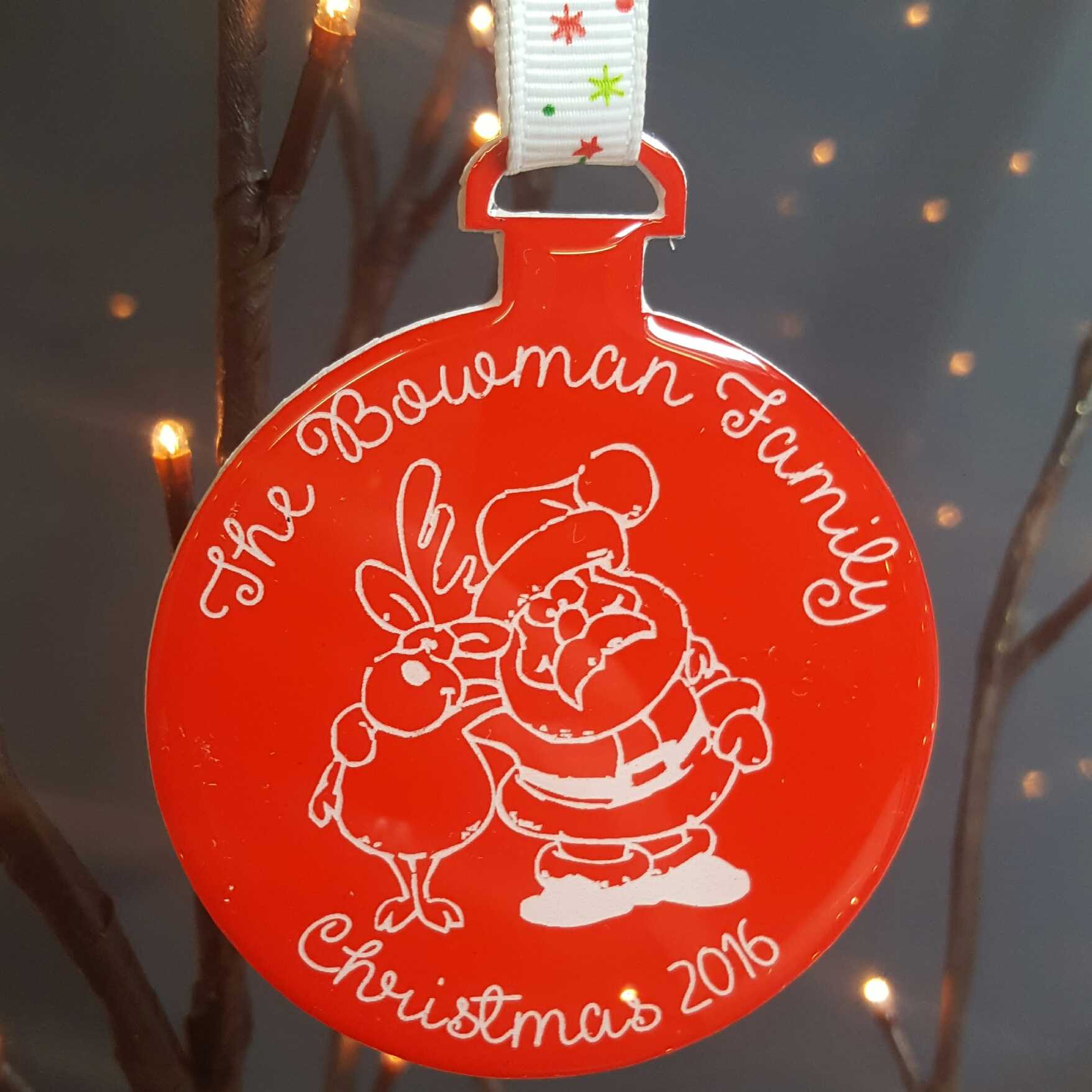 This decoration is perfect for a Christmas gift as well as a lovely addition to your own Christmas tree. It comes in a choice of clear perspex or a colour of your choice with a clear resin finish. The text on the top and bottom lines can be changed to suit your own personal needs.