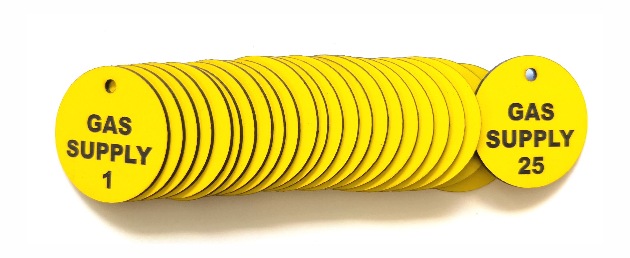 From as little as £0.71 each + vat these are the most popularsize of titled valve tags . Each tag is supplied with 100mm length of ball chain and connector for conveniently attaching them to valves. 16 colours of interior grade plastic laminate are available.The tags have a consistent discriptive title prefixing consecutive numbers from 1, 2, 3, through to the quantity you order and best of all - the more you buy the cheaper the unit cost! (for clarity of characters please keep titles as brief as possible)