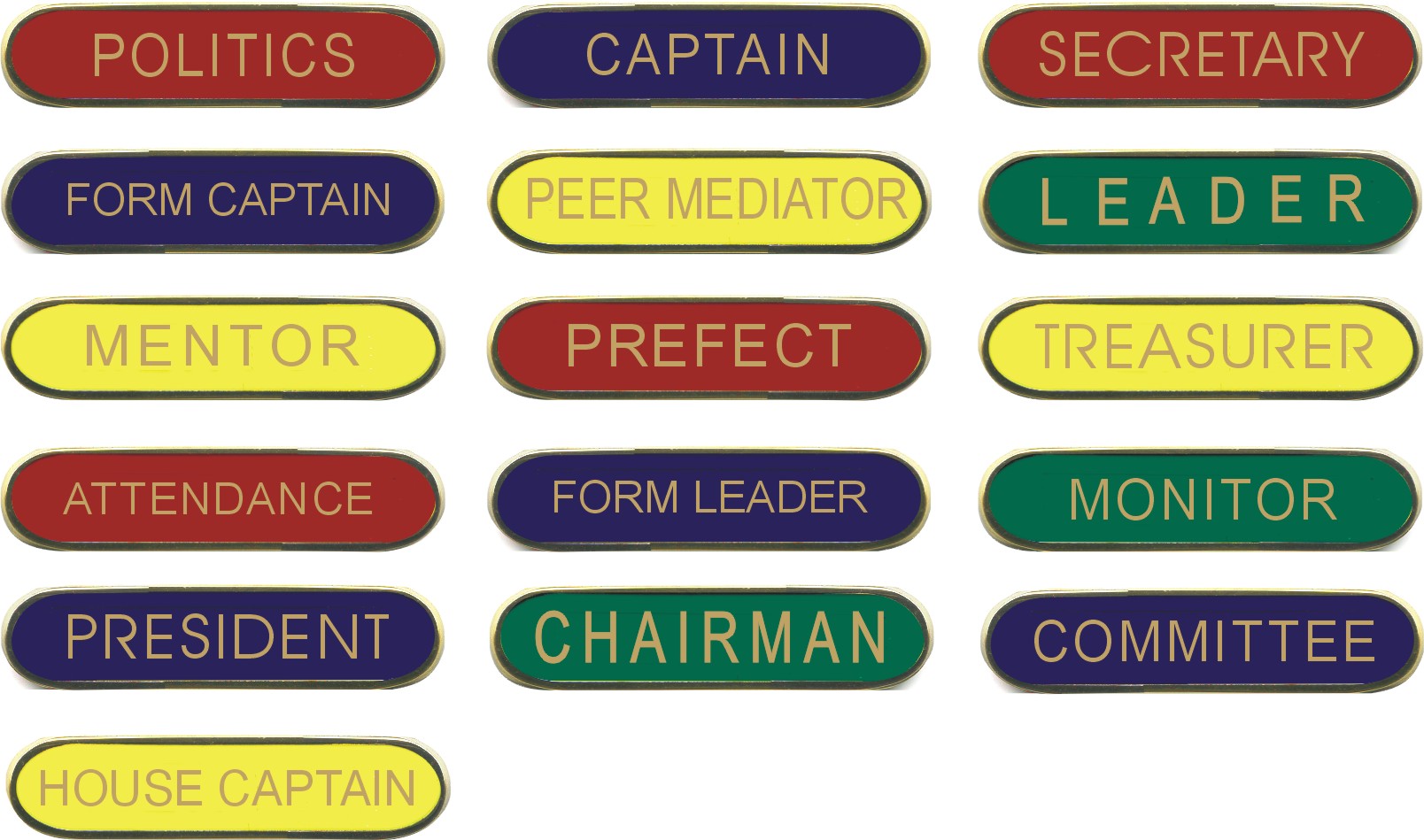 These badges are made of hard enamel which has a beautiful lustrous smooth finish that will last the test of time. The text and outer border of the badges are gold metal and each design can be ordered with red, yellow, blue or green enamel.