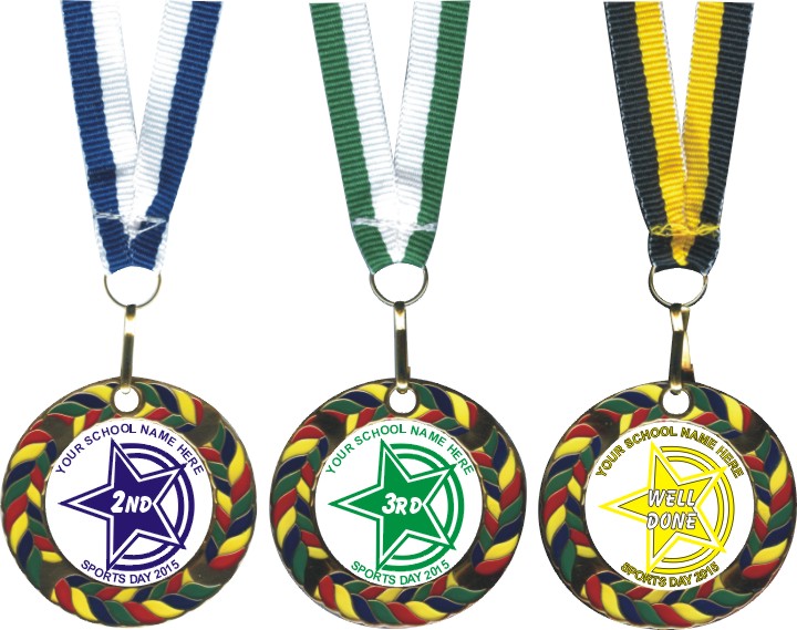 At the top of our Sports Day Range these Superb Enamel Medals have a colourful top quality enamel border that enhances the printed centres and offers your students the ultimate reward for their acheivements. The medal centres are printed in 4 different colours to denote 1st, 2nd, 3rd and Well Done. and various designs are available for you to select.