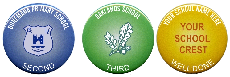 You can now have button badges complete with your own school crest and school name in the colours shown above to denote 1st, 2nd, 3rd, and Well Done.
