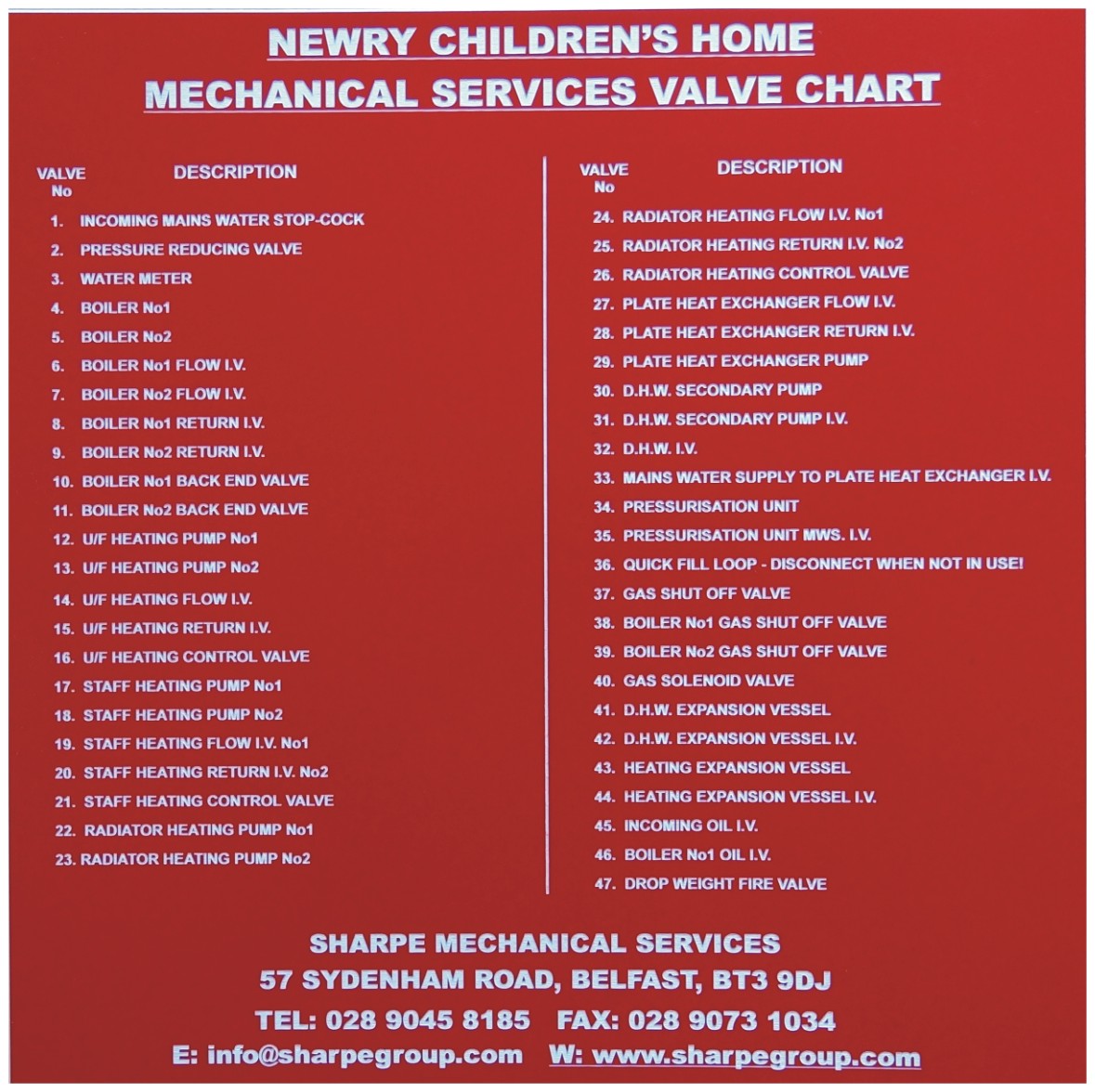 When you use valve tags with numbers to identify the valves on your pipework then valve charts are the ideal way to give a complete description of what each valve controls. Valve Charts are usually produced in 1.5mm interior grade engraving laminate but if you need anything else please use the "Tell us what you want" box to let us know.