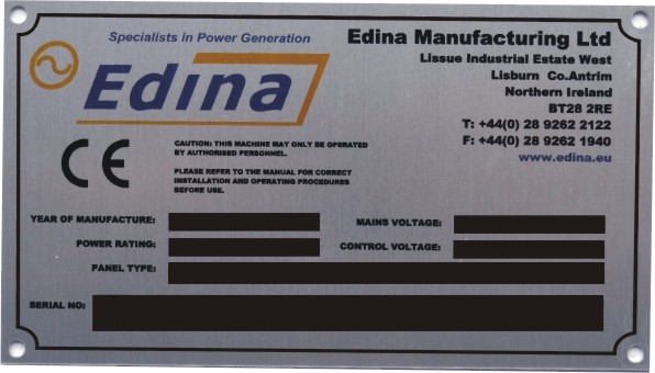 160mm x90mm x 1.0mm with black lettering, 4 holes @ 4.0mm diameter, square corners. Quantity 100, Price £3.50 each + vat