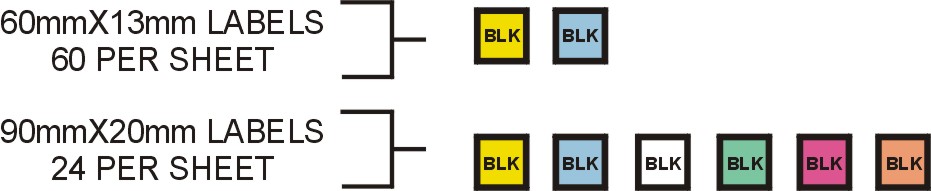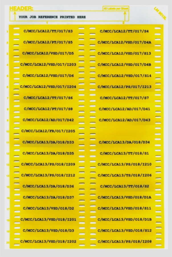 The 90mmx13mm size are available from stock in yellow with black text as shown below. They are supplied to you with the text you require printed on A4 sheets of 40 labels per sheet.